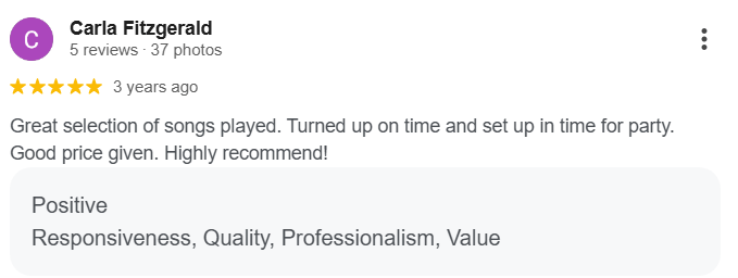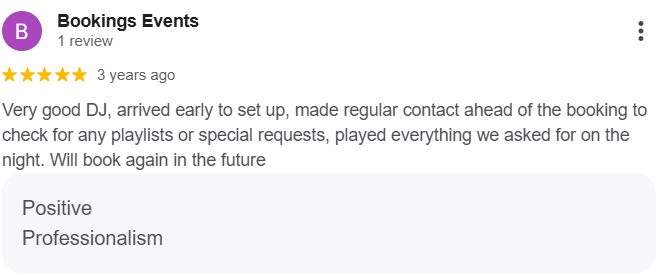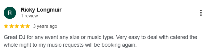 Huge THANK YOU to everyone that has left me a review in the past. If I’ve been lucky enough to DJ for you before and you’d like to leave a review, please click here.